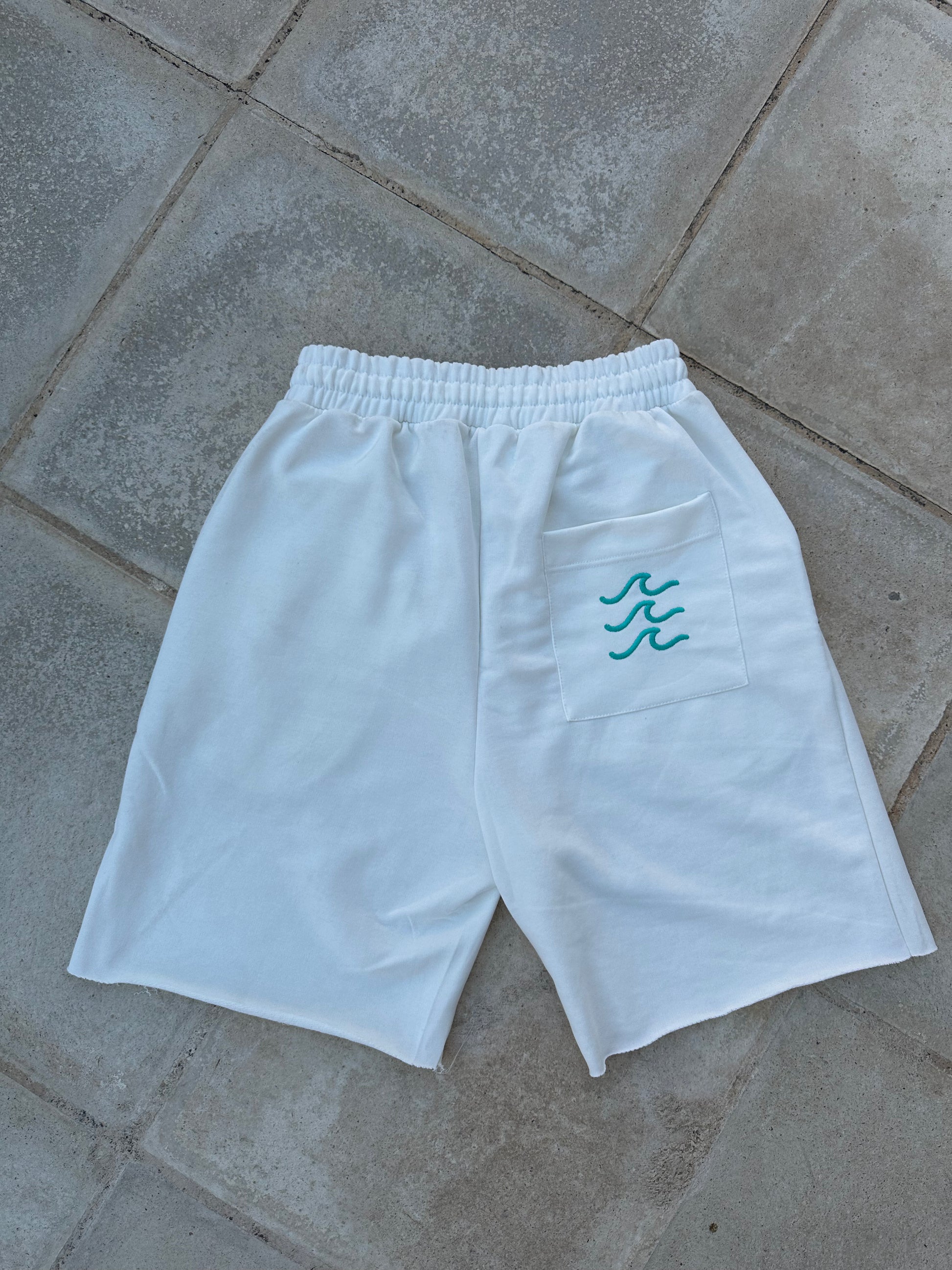 These shorts carry the freshness of the ocean in their Tiffany Blue shade, a color that feels both vibrant and serene. On the back pocket, the flowing bleu wave embroidery symbolizes the tide’s rhythm, grounding the soft hue with a bold detail.